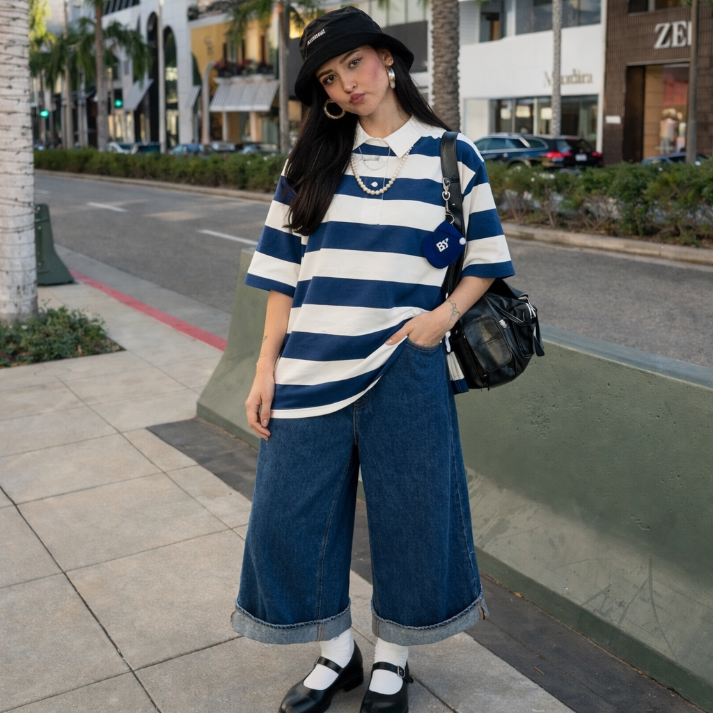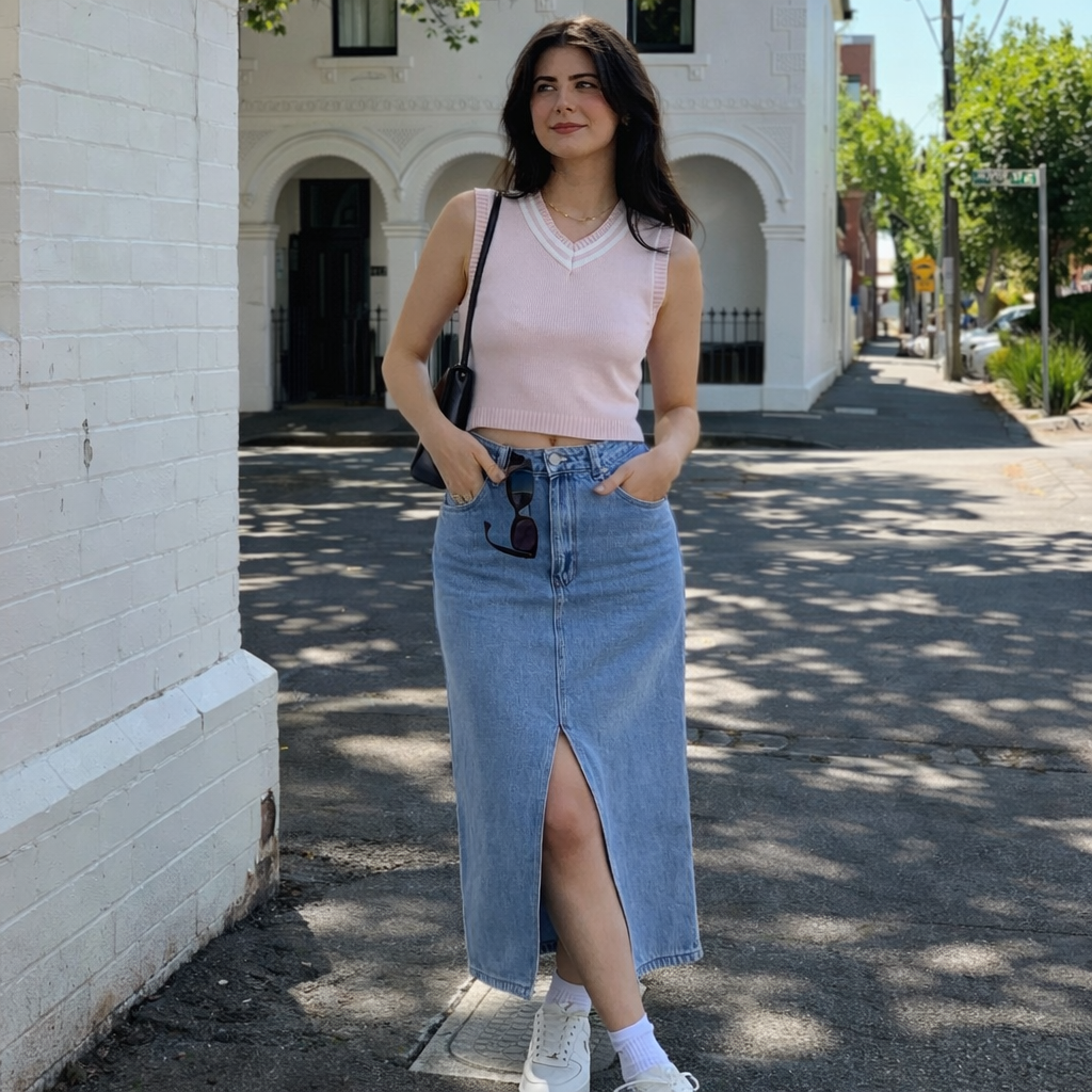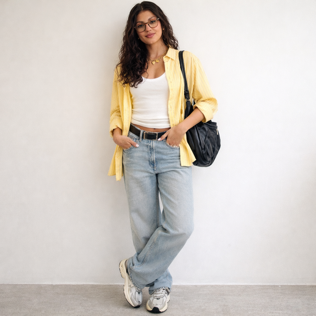 Start with a basic tee and relaxed denim. Add clean sneakers and a simple tote for balance.