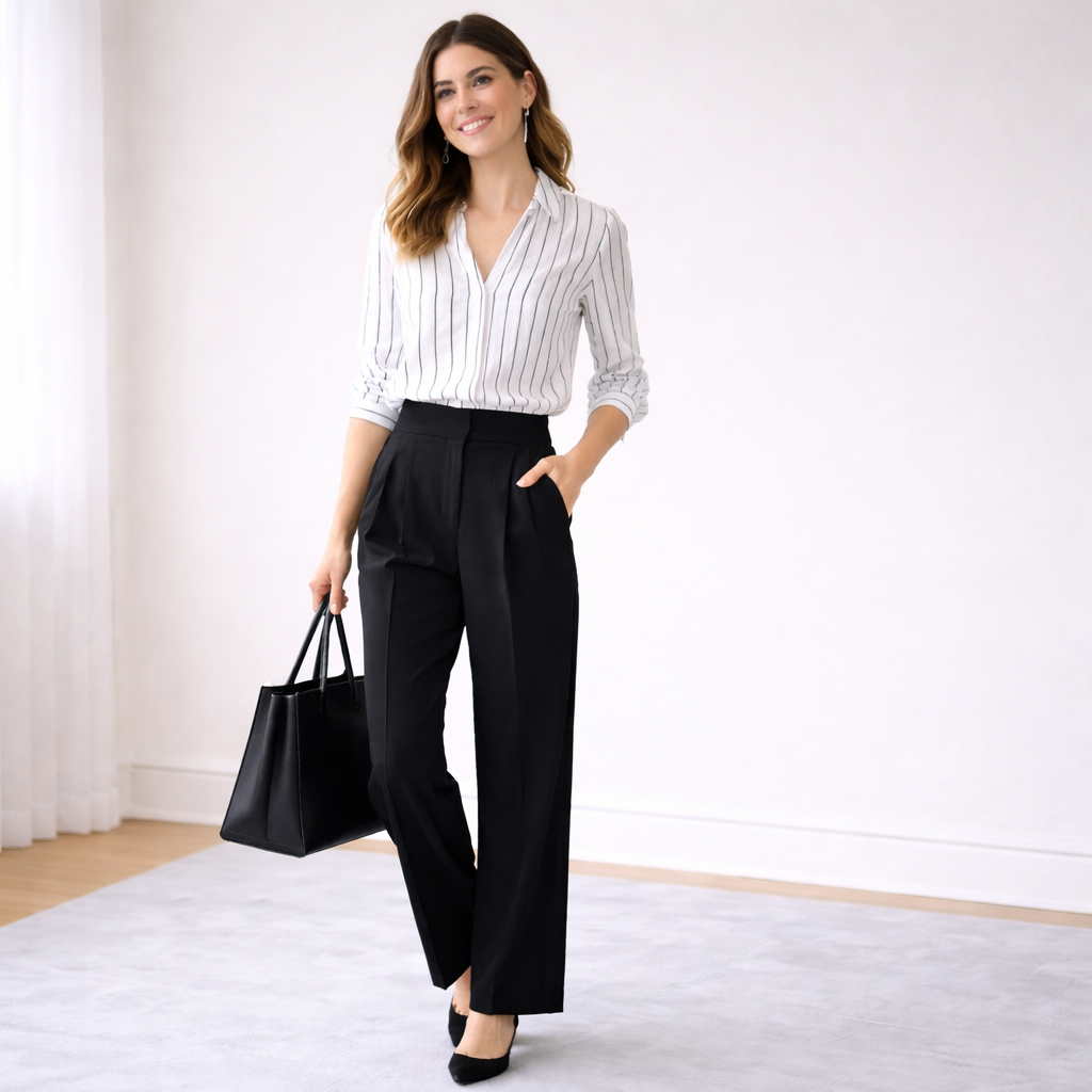 A clean and polished interview outfit that balances professionalism with comfort. The striped blouse paired with high-waisted black trousers creates a structured, confident look, while the classic tote adds a practical touch—perfect for making a strong first impression without trying too hard.