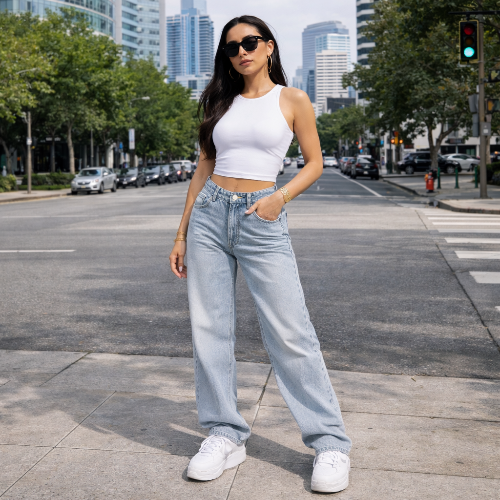 A casual latina outfit is simple but still put-together. Pair a white crop top with high-waisted jeans and clean sneakers for an easy everyday look. Add a tote bag and minimal jewelry to keep it relaxed.
