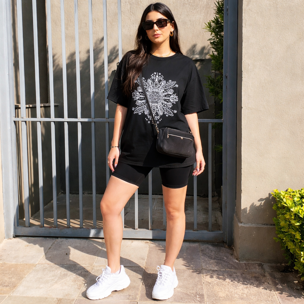 Street style brings out a more edgy side of latina fashion. Try an oversized graphic tee with biker shorts and chunky sneakers. Add sunglasses and a mini crossbody bag to complete the vibe.
