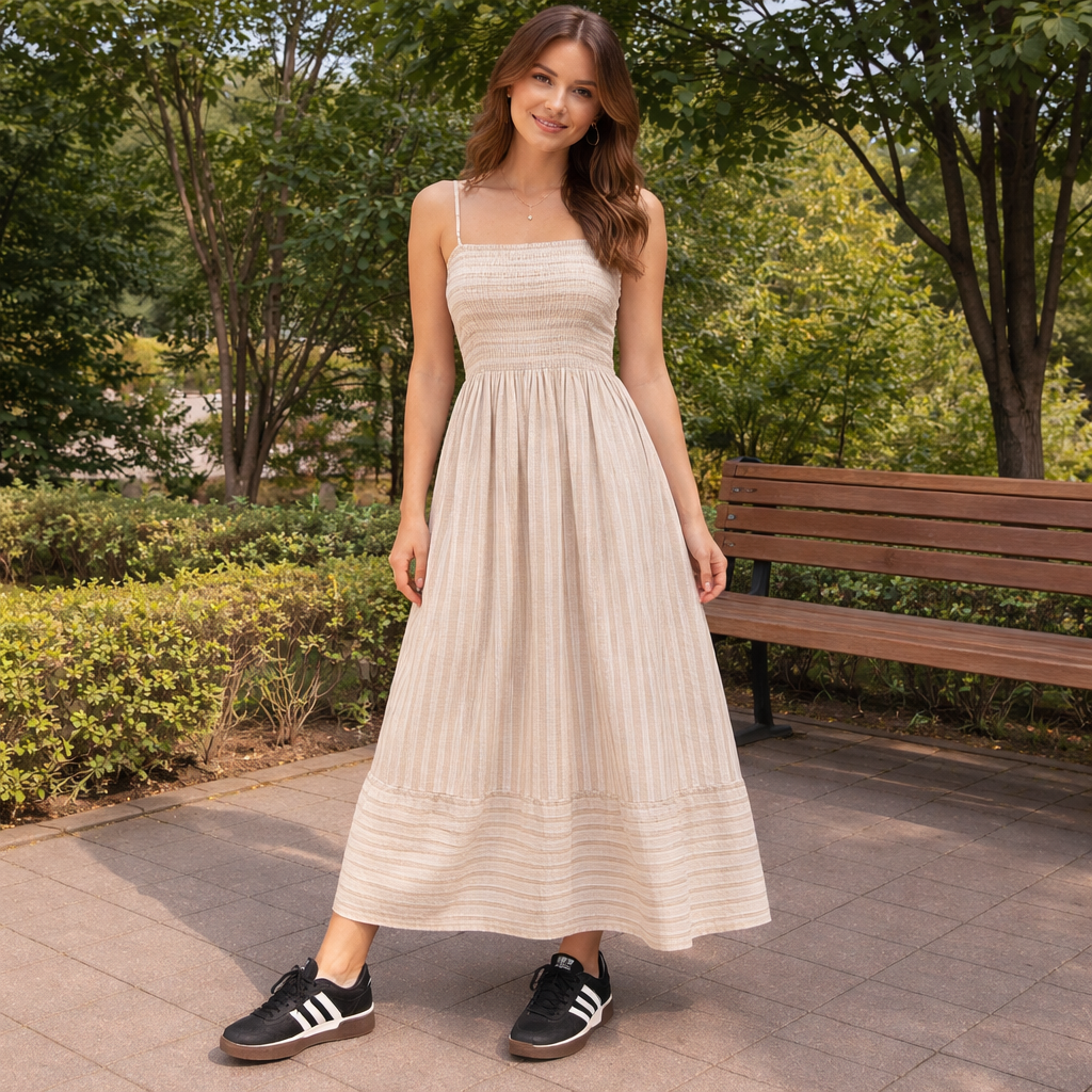 2. Linen Midi Dress + Sneakers (Hot Weather Essential)