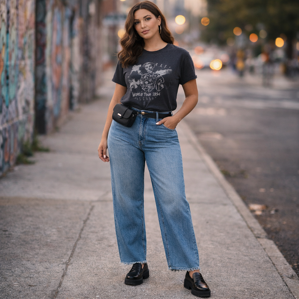 Not every wide leg jeans look needs to be polished. A graphic tee with wide leg jeans hits that effortless cool energy that works from high school hallways to weekend concerts. The loose tuck keeps it from looking sloppy while platform shoes add enough height that the jeans don’t drag. This outfit proves you can be comfortable and stylish at the same time, a combination that works at literally any age.