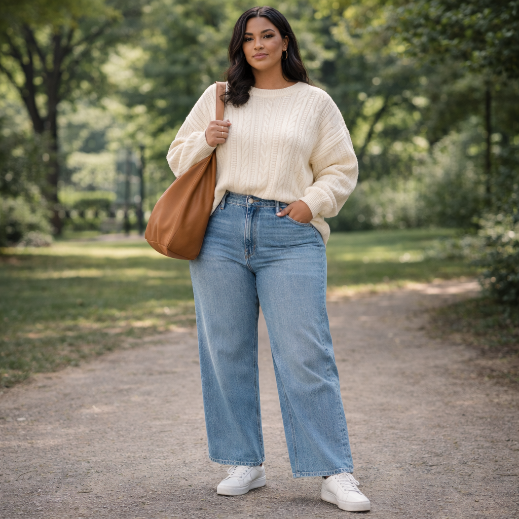 Wide leg jeans outfit ideas don’t always have to be dressy. This cozy combination works whether you’re eighteen and heading to Saturday brunch or fifty-two and spending the afternoon at the farmers market. The half-tuck keeps the oversized sweater from overwhelming your frame while maintaining that effortless weekend energy. Light wash denim with cream knitwear creates a soft, approachable palette that photographs beautifully too.
