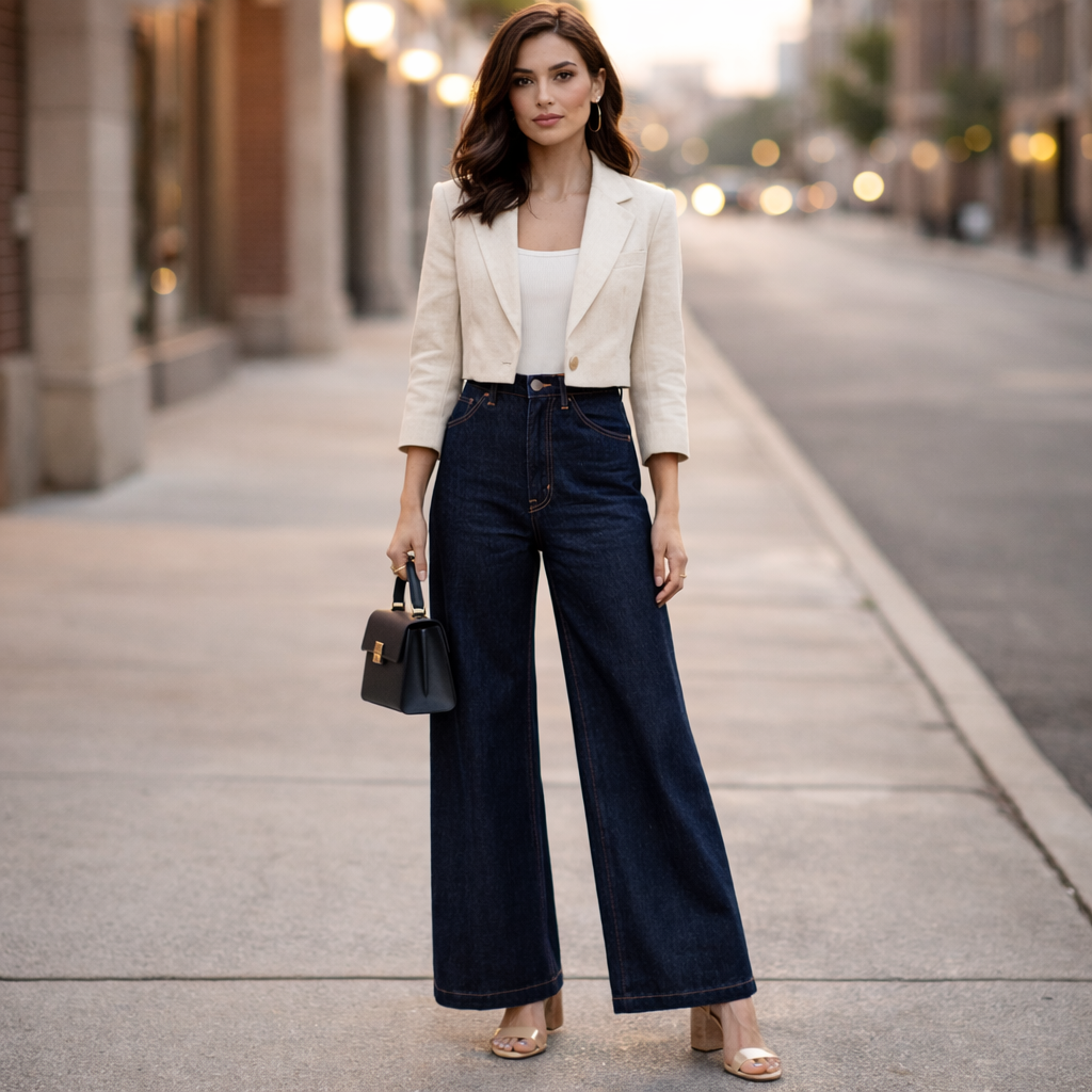 Here’s an unpopular opinion: cropped blazers work better with wide leg jeans than full-length ones. The shorter jacket length emphasizes your waist while the wide leg creates that elongated bottom half. This combination reads sophisticated without being stuffy, perfect for work presentations, client meetings, or any situation where you need people to take you seriously while still looking like yourself.