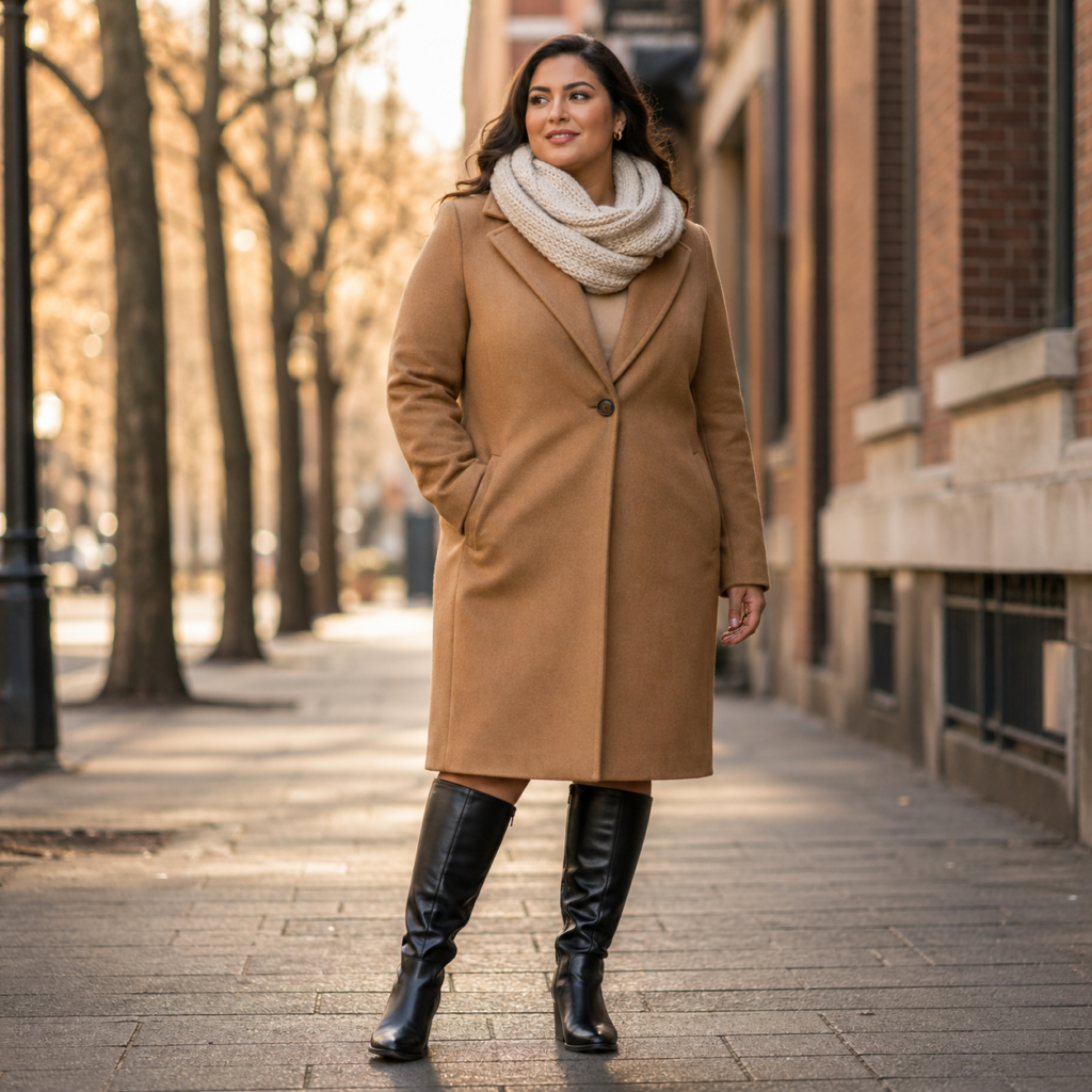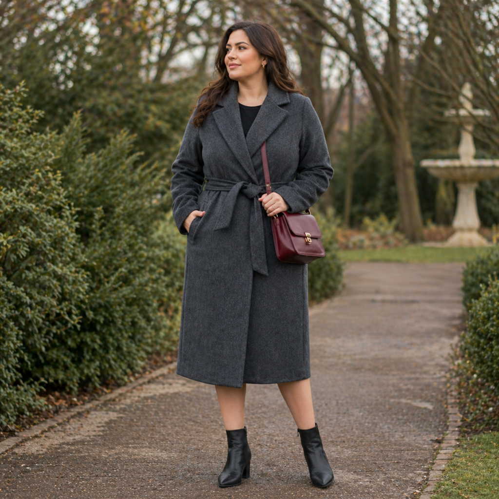 The silhouette matters more than the brand. A wrap coat with a tie belt flatters every body type from petite to plus because it creates that coveted hourglass shape naturally. Avoid boxy puffer coats for anything beyond dog walks and airport runs — they add visual weight regardless of actual body size.