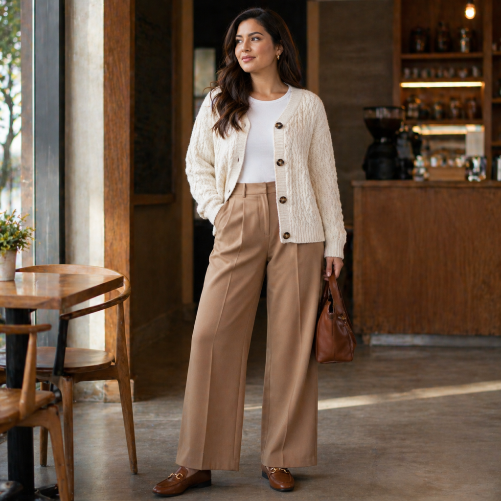 A chunky cable knit cardigan works across decades — your teenage daughter and her grandmother can both rock this look because knitwear transcends age. The key is proportion. If your cardigan is oversized and chunky, your bottom layer should be fitted: slim jeans, tailored trousers, or even a midi skirt with tights.
