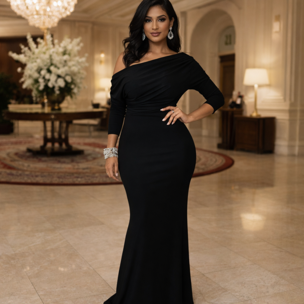 This Elegant Shoulder Bodycon Evening Dress has a clean, structured silhouette with subtle shoulder detail, giving it a refined, old-money feel that works beautifully for formal dinners, events, or understated evening looks.