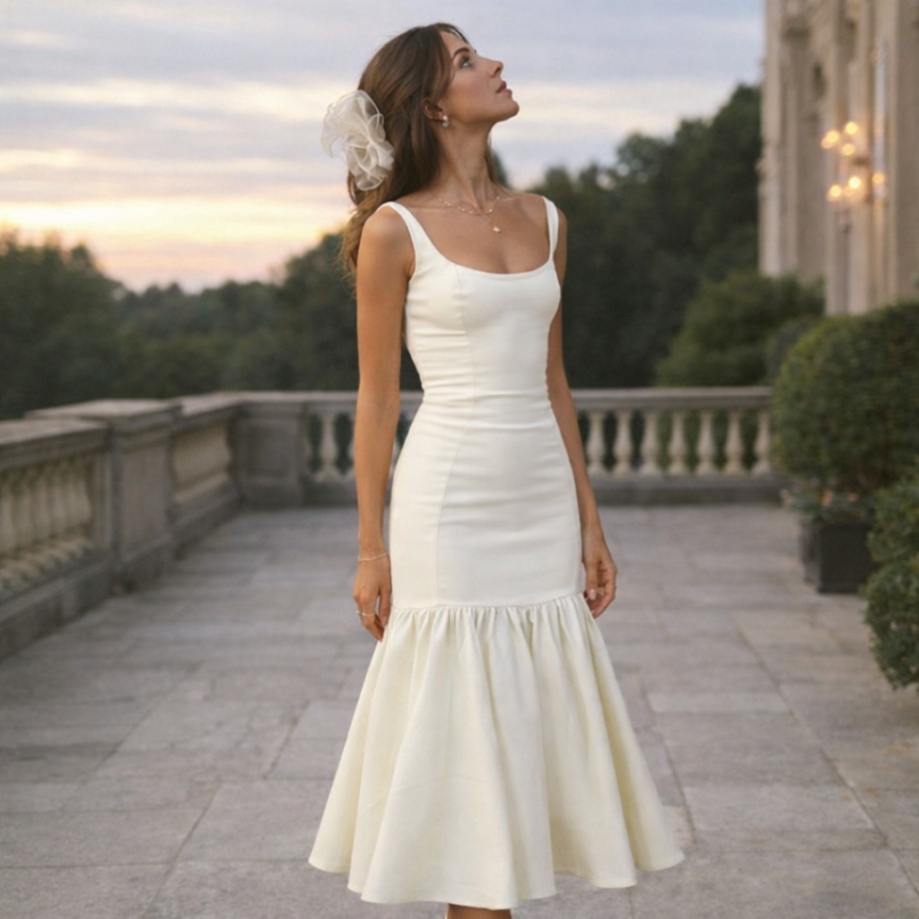 Old money dresses for weddings are refined and minimal. Bridal styles favor ivory, cream, or soft neutral shades with structured bodices and elegant silhouettes. Wedding guest and bridesmaid looks follow the same rules — polished, modest, and timeless. The goal is to look elegant without overshadowing the moment.