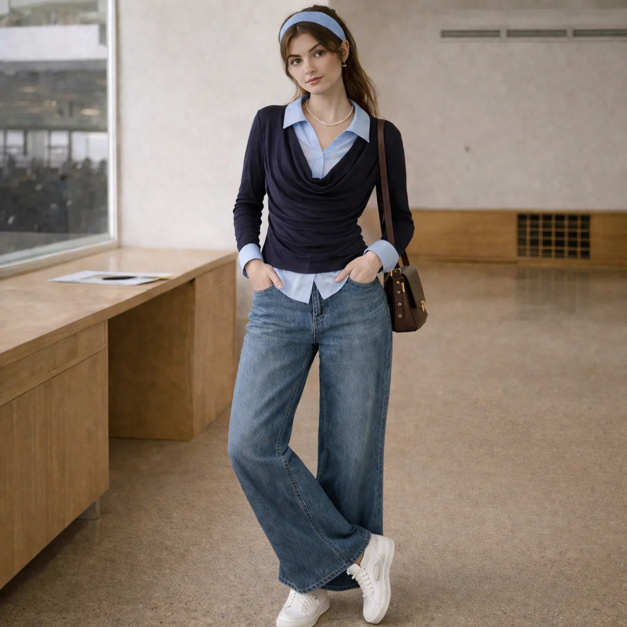 Effortlessly put-together and perfect for college days, this look blends comfort with a polished vibe. The layered shirt and knit top add a smart touch, while relaxed wide-leg jeans and white sneakers keep it easy and practical for all-day wear.