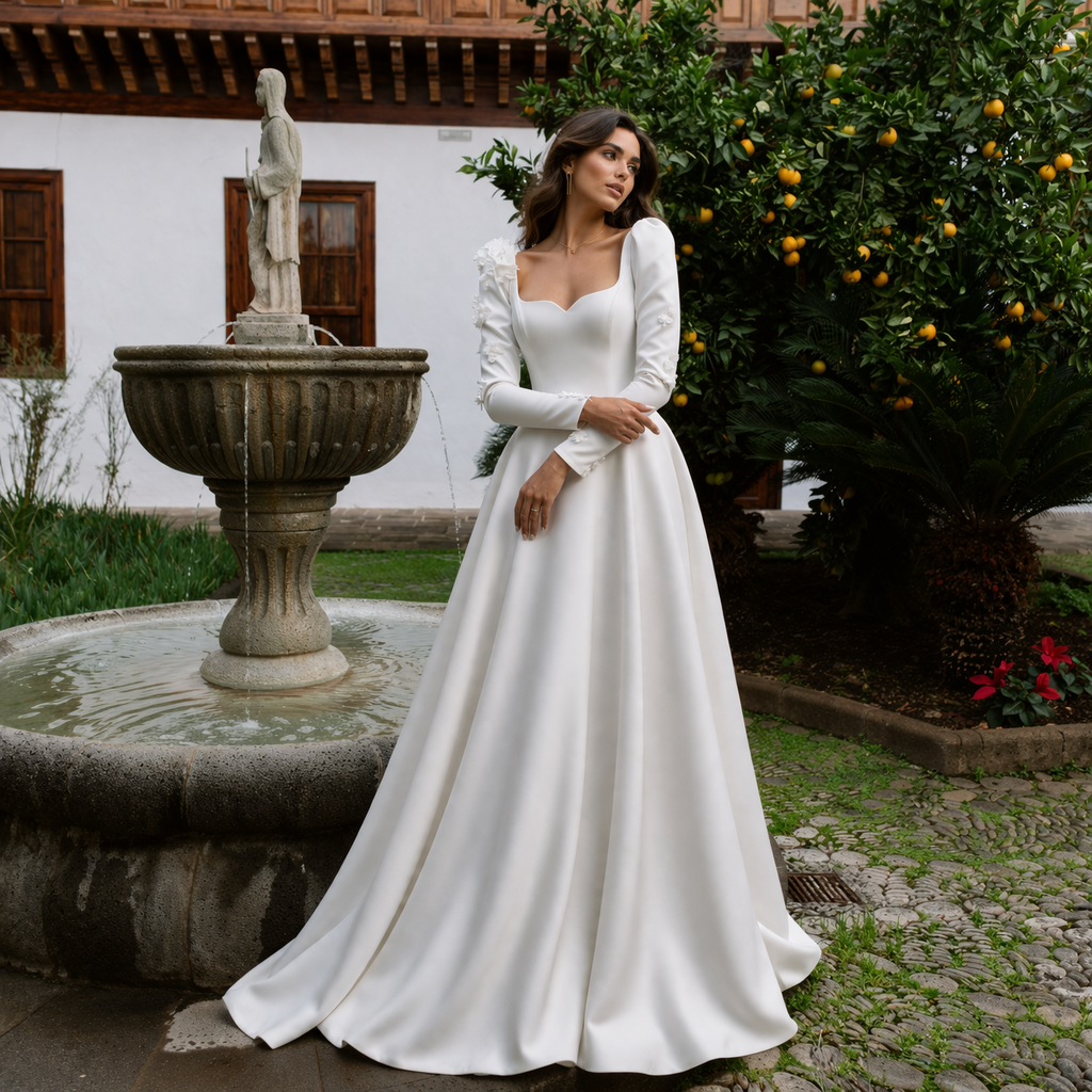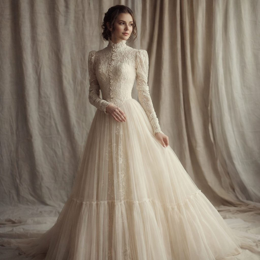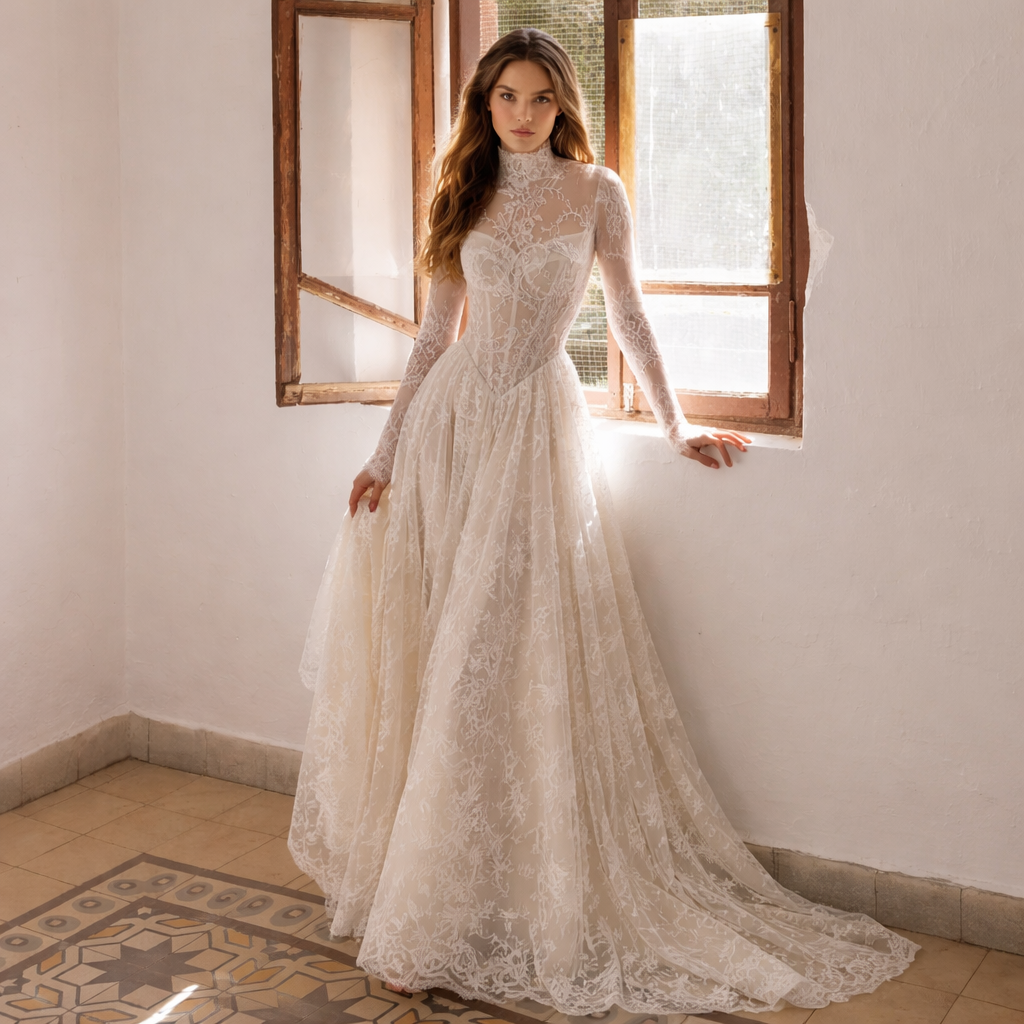 Elegant and modest, ideal for a classic bridal aesthetic.
